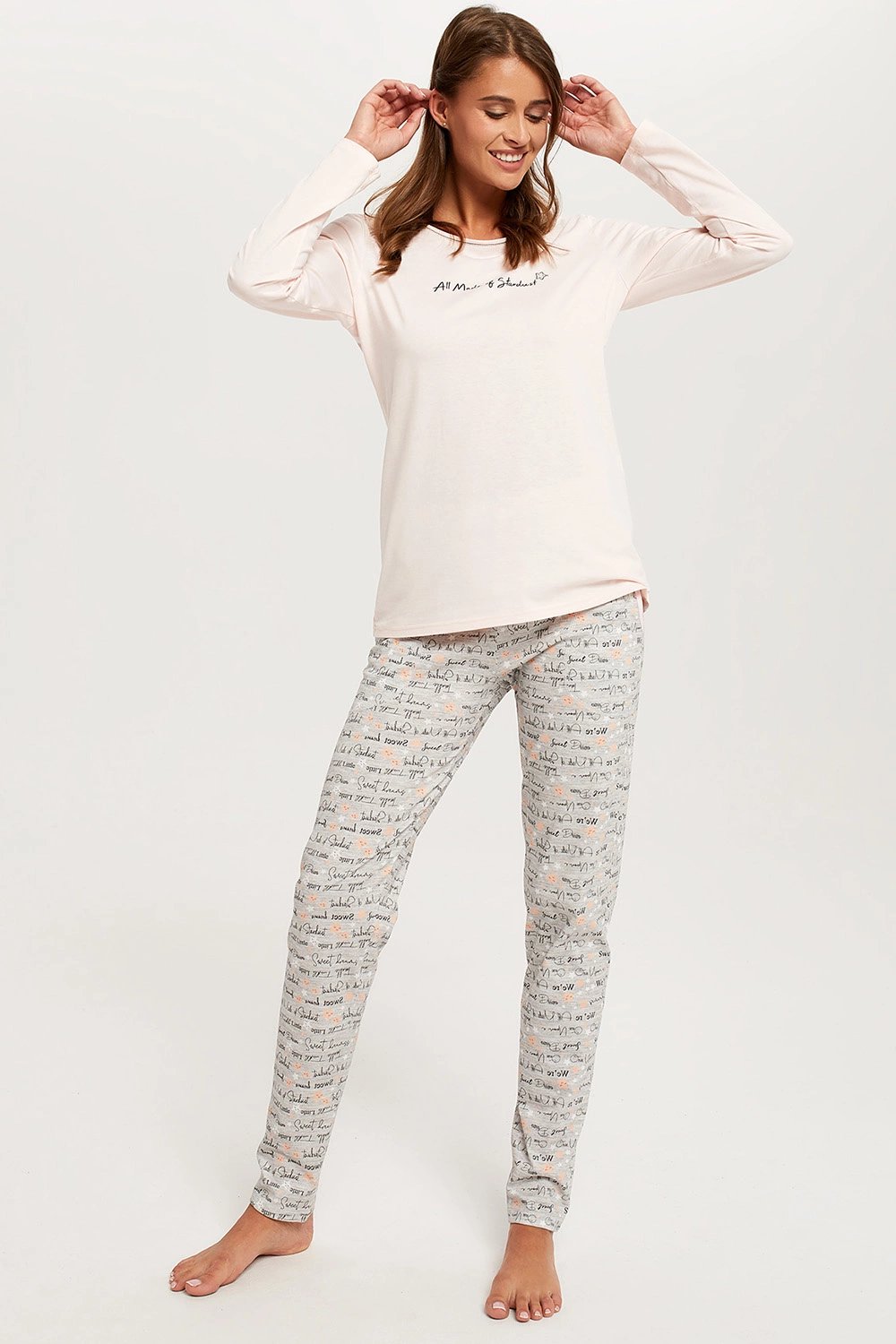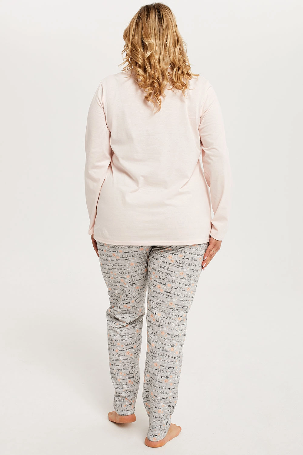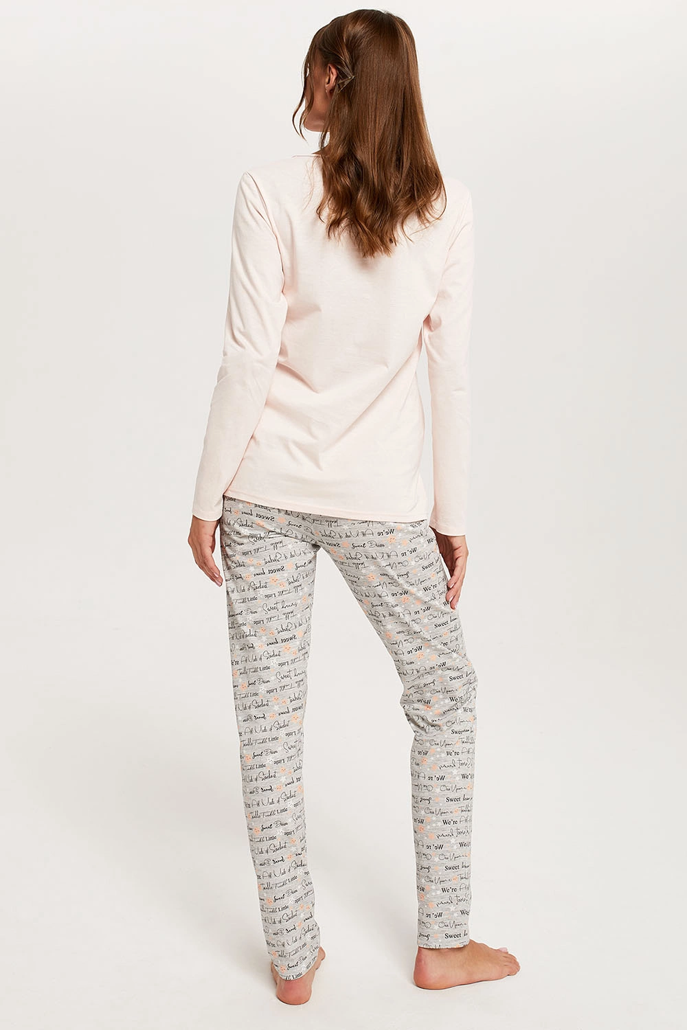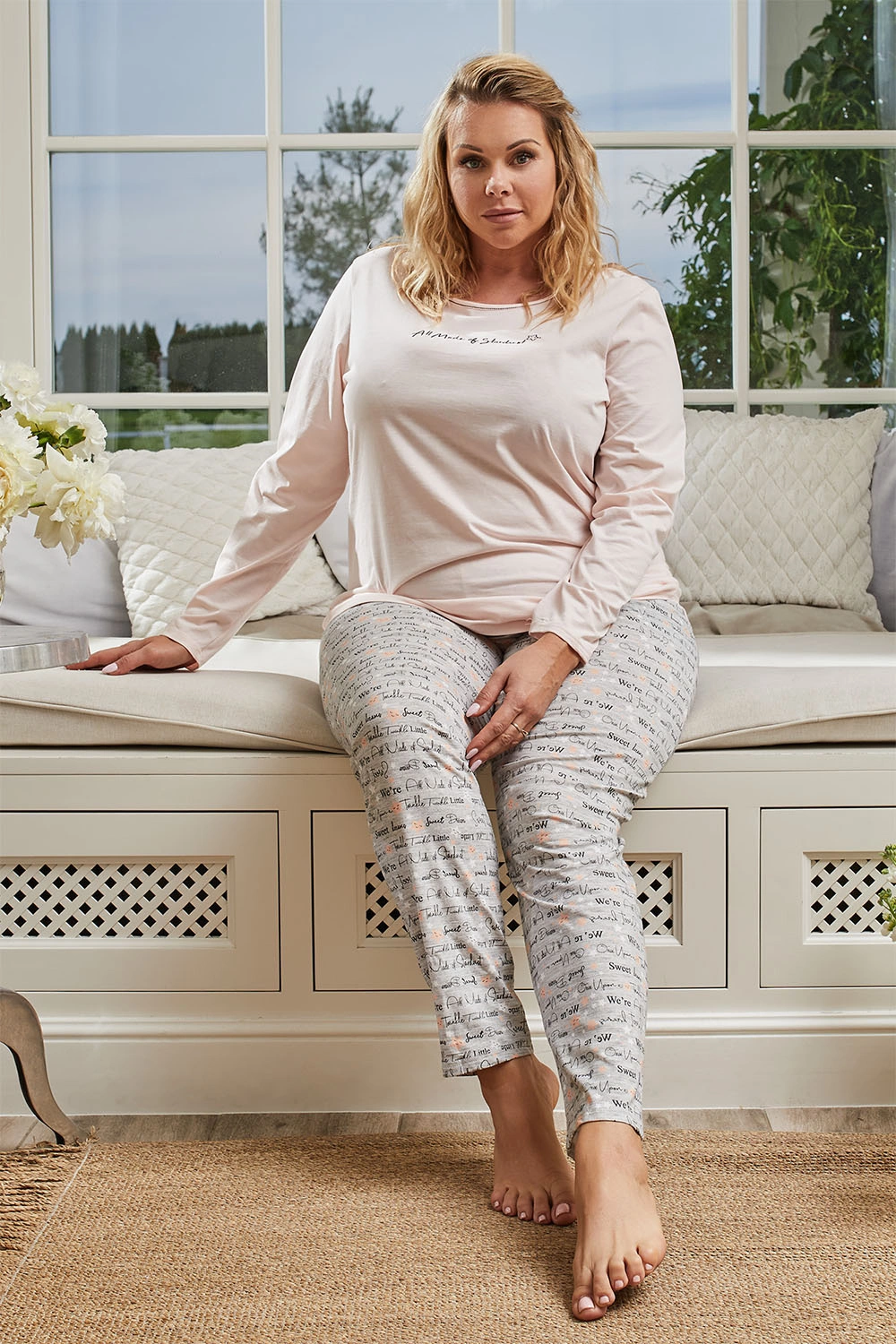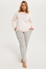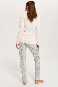 Piżama damska Karla to perfekcyjne połącznie jasnych, subtelnych łososiowo- szarych barw z ciekawym i oryginalnym wzorem.