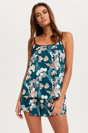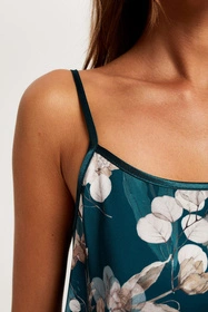 Satynowy komplet piżamy damskiej w kolorze butelkowej zieleni.