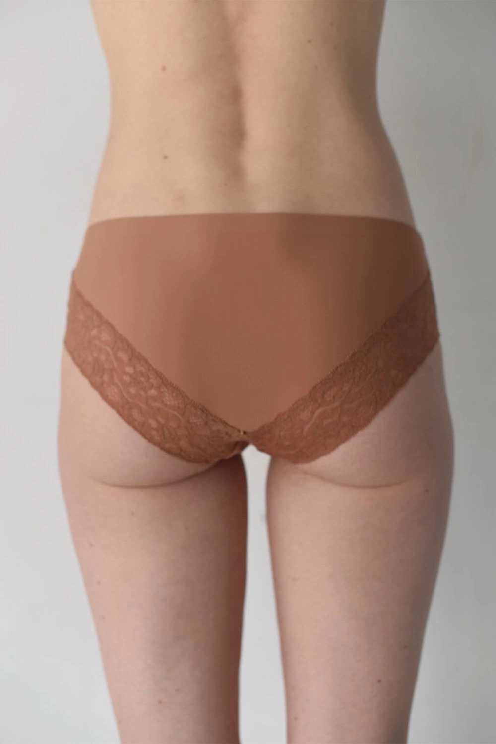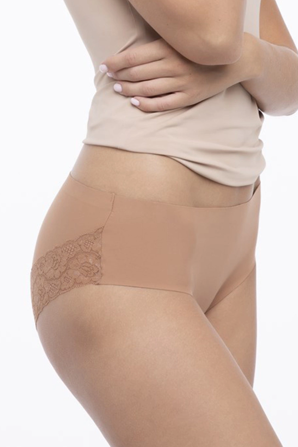 Figi CHEEKIE z koronkowym wykończeniem na pośladkach tym razem w kolorze karmelowym (ciepłe tony beżu i brązu). Wygodne i bezszwowe figi CARMEL dzięki swojemu naturalnemu, uniwersalnemu kolorowi oraz opatentowanej technologii JULIMEX INVISIBLE-LINE®, pozostaną niewidoczne nawet pod mocno dopasowanymi strojami. Krój bardzo dobrze podkreśla pośladki i dodaje pewności siebie.