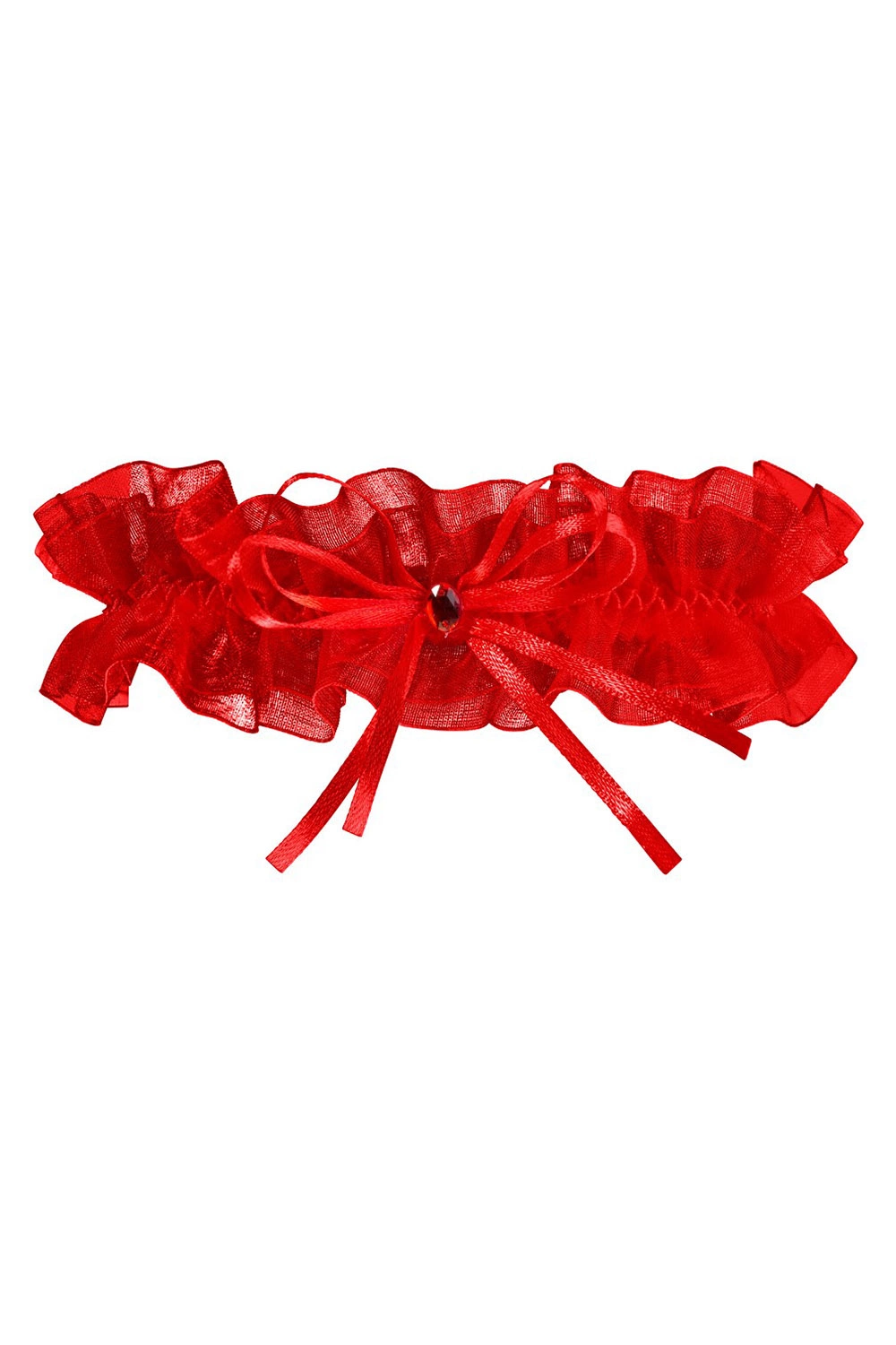 Uwodząca intensywnym odcieniem czerwieni podwiązka z dwóch warstw subtelnego tiulu. Jej ozdobą jest kokardka z wąskiej taśmy i kryształowe oczko. To propozycja przeznaczona na studniówkę. Nie zsunie się w tańcu dzięki umieszczonemu od spodu paskowi silikonu.