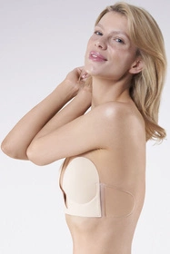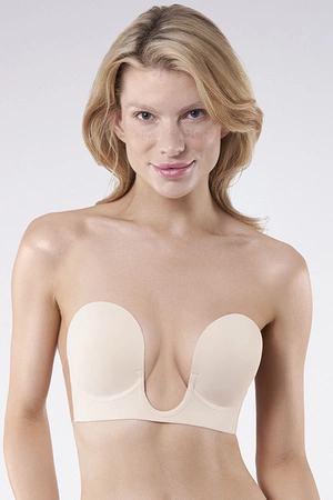 Materiałowy biustonosz w kolorze beżowym to świetne rozwiązanie do mocno wyciętych sukienek z głębokimi dekoltami w kształcie litery V i nie tylko. Brak ramiączek i obwodu pozwala także nosić go zawsze, gdy chcesz wyeksponować nagie ramiona lub plecy. Konstrukcja biustonosza wzmocniona jest fiszbinami po bokach i w mostku, natomiast samoprzylepne, transparentne skrzydełka zapewniają dodatkowy komfort podczas noszenia i doskonale zastępują pełny obwód. Wypełnione atestowanym, silikonowym klejem miseczki doskonale przylegają do skóry i uwydatniają biust, nadając mu idealny wygląd. Po przemyciu warstwy klejącej biustonosz V!bra może być użyty wielokrotnie.