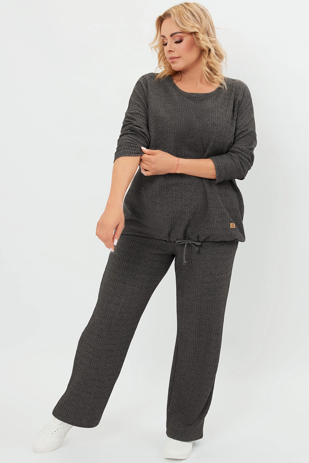 - luźna bluzka z wiązaniem na troczki u dołu, które pozwala lepiej dopasować ją do sylwetki