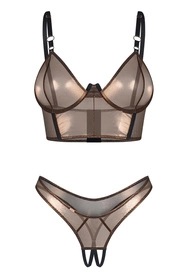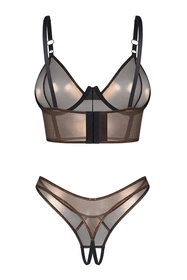 Obsessive Soranna to zmysłowy komplet z topem i stringami, który łączy efektowny wygląd z wygodą noszenia. Top zapewnia subtelne podparcie biustu dzięki wzmocnieniom i pionowym fiszbinom, pomagając utrzymać kształt. Zapięcie na haftki z tyłu ułatwia dopasowanie obwodu, a regulowane ramiączka pozwalają precyzyjnie ustawić długość. Ramiączka są nieodpinane, co podnosi stabilność konstrukcji podczas ruchu. Miękka, elastyczna tkanina przyjemnie układa się na ciele i pracuje z sylwetką. Koronkowe wykończenia i delikatna siateczka nadają lekkiego, zmysłowego charakteru. Stringi mają otwarty krok, co dodaje śmiałości i podkreśla erotyczny charakter zestawu. Klasyczna linia majtek ładnie zaznacza biodra, a sprężyste brzegi pomagają utrzymać całość na miejscu. Metalowe detale przy ramiączkach dodają elegancji i trwałości wykończenia. To propozycja na specjalne wieczory i chwile we dwoje, ale także na momenty, gdy chcesz poczuć się wyjątkowo we własnej skórze.