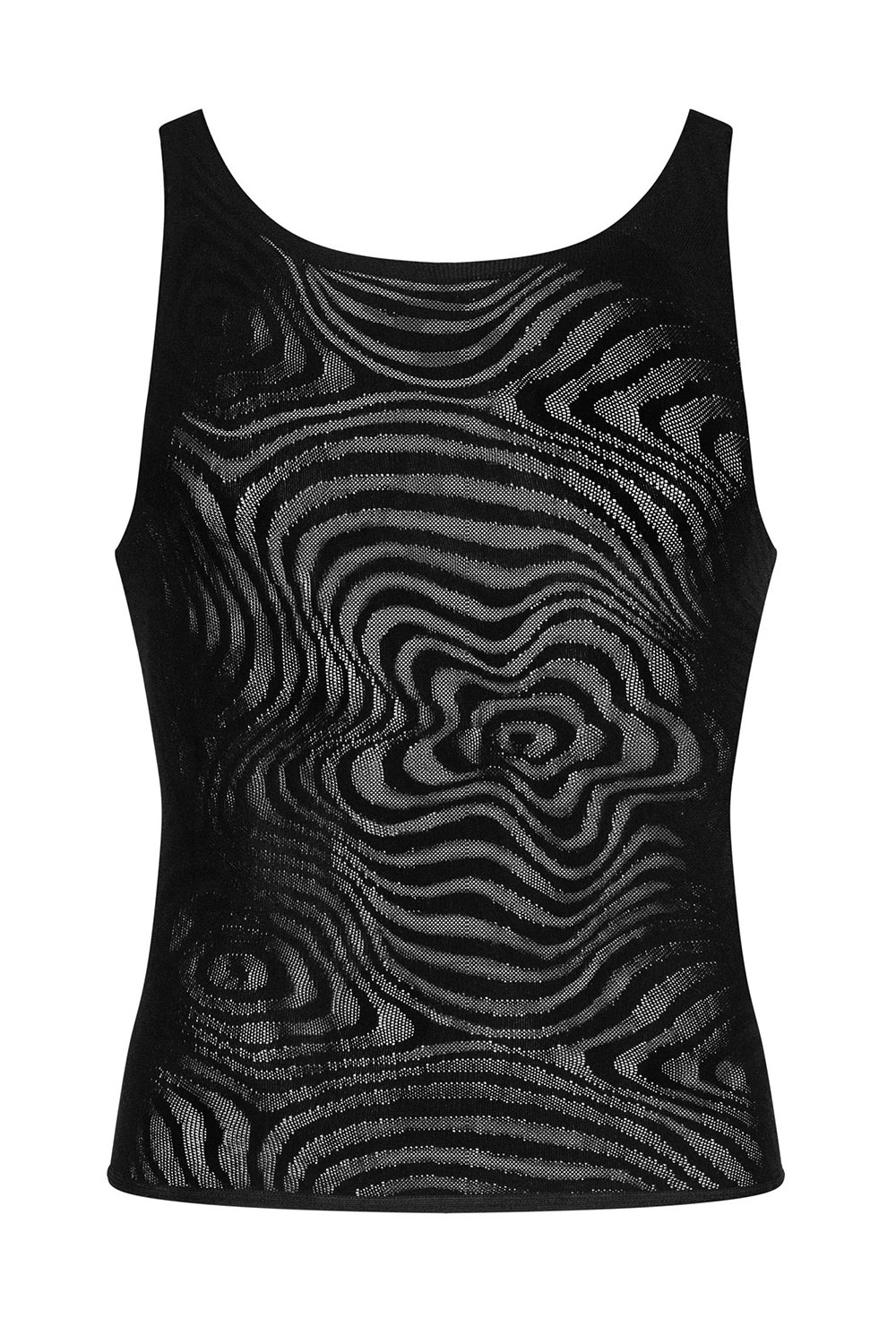 Czarna męska koszulka na ramiączkach. Wykonana z najwyższej jakości doskonale elastycznej dzianiny, która idealnie podkreśla atuty męskiego ciała. Nowoczesne, geometryczne wzory przyciągają wzrok i seksownie prezentują się na ciele. Skuś się na komfort i pełnię wygody w wersji, która z pewnością rozpala zmysły!