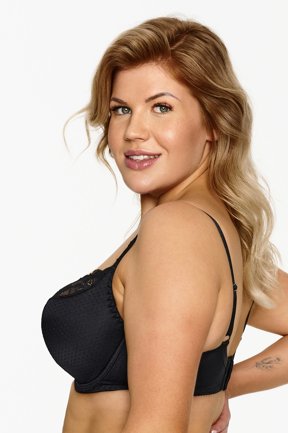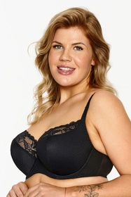 Elegancki półusztywniany biustonosz. Dolna część miseczki oraz mostek wykonane są z mikrofibry w drobne kropeczki. Górna część miseczki pokryta jest koronką. Tył wykonany jest z gładkiej dzianiny.