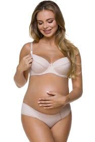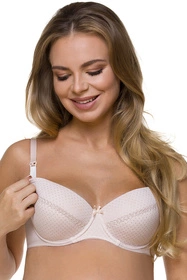 Elegancki usztywniany biustonosz wykonany z mikrofibry w drobne kropeczki. Biustonosz wspaniale sprawdzi się podczas karmienia, dzięki wygodnie odpinanym klipsom Clic-Clac umożliwiającym odpięcie i zapięcie miseczki jedną ręką, a tym samym karmienie dziecka bez zdejmowania biustonosza. Miseczki wyścielone od wewnątrz bawełną o wykończeniu antybakteryjnym, co podnosi komfort użytkowania. Tył wykonany jest z gładkiej dzianiny.