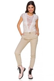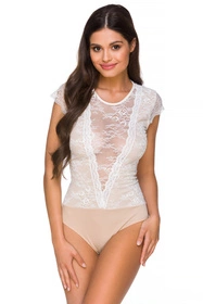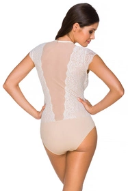 Zmysłowe beżowe body wykonane z prześwitującego plenu, gładkiego materiału i wytwornej koronki. Część figowa wykonana z nieprześwitującej mikrofibry. Wspaniale sprawdza się jako dodatek do garderoby dziennej, zarówno do spodni jak i spódnicy. Zapinany w kroku na zatrzaski.