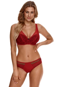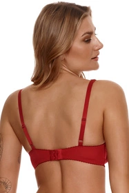 Koronkowy biustonosz typu push-up. Model posiada termicznie formowane miseczki z wkładką żelową. Krój biustonosza zbiera piersi z boków i nadaje im krągły kształt, akcentując linię dekoltu. Koronka stanowi przedłużenie misek do ramiączek, zdobiąc dekolt. Między miseczkami delikatna kokardka w czarnym kolorze, dodająca uroku całości. Ramiączka regulowane, nieodpinane. Z tyłu zapięcie na haftki.
