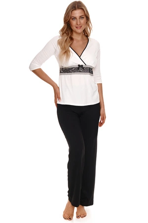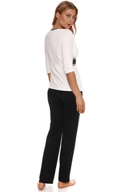 Elegancka dwuczęściowa piżama. Bluzka z rękawem o długości 3/4. Dekolt w kopertę, podkreślony został czarną lamówką, zaś linię misek podkreśla czarna koronka oraz delikatna kokardka. Dół stanowią czarne, długie spodnie z prostymi nogawkami, które kontrastują z górą. W pasie wygodna gumka.