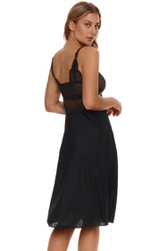 Kobieca koszulka w czarnym kolorze. Góra koszulki wykonana z połączenia cielistej siatki i czarnej koronki. Dół rozkloszowany z czarnej wiskozy, długość do połowy łydki. Dekolt zdobi delikatna kokardka z mieniącą się ozdobą. Ramiączka regulowane, nieodpinane, na łączeniu z przodu z koszulką również ozdobione kokardkami, z tyłu zaś ramiączko dodatkowo ozdabia koronka.