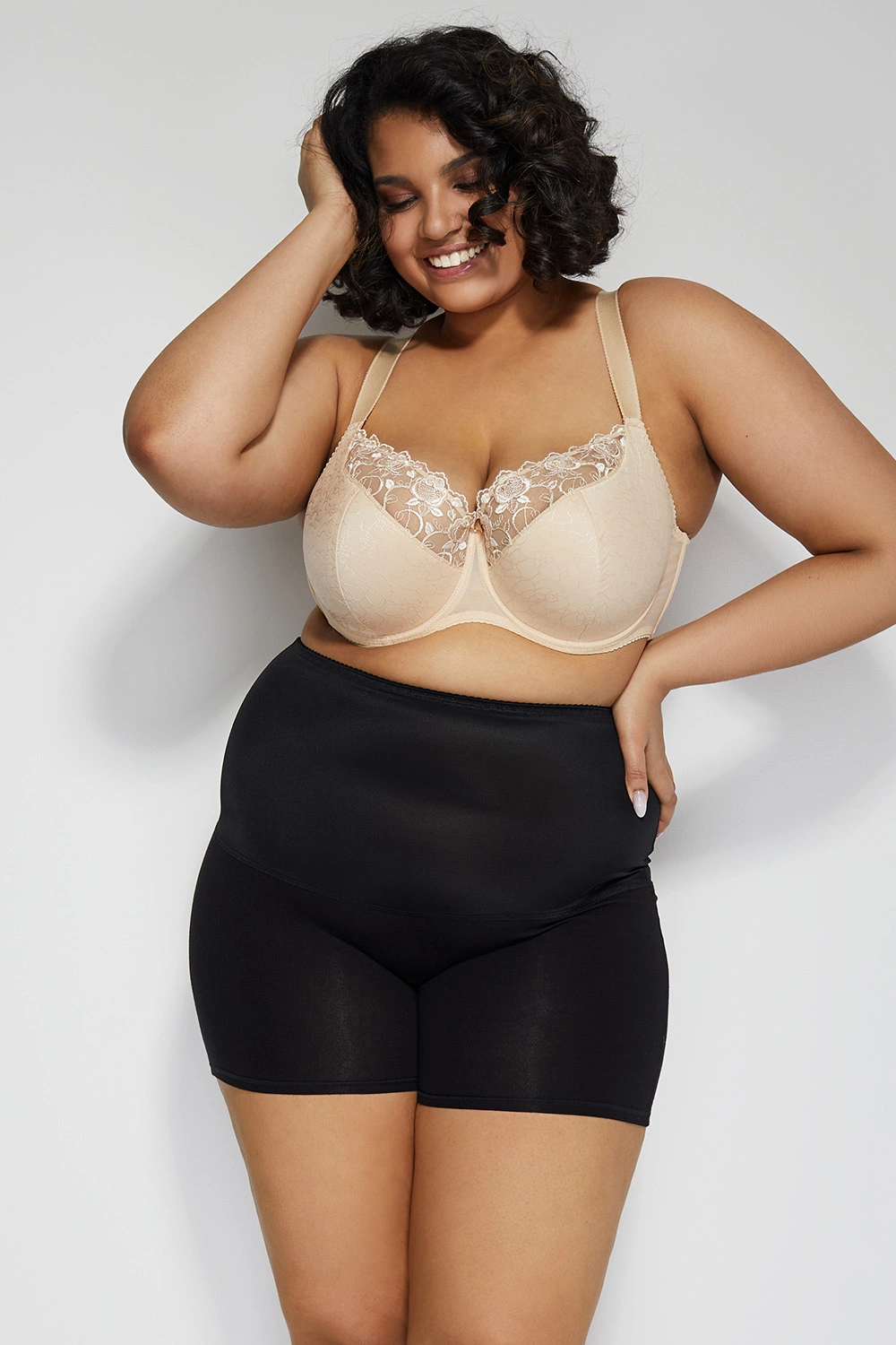 Figi korygująco-modelujące z nogawkami. Mocna poliamidowa dzianina tworzy z przodu i z tyłu pas idealnie wyszczuplający najbardziej problematyczne strefy kobiecego brzucha oraz bioder. Bawełniany dół z nogawkami wyszczupla uda jednocześnie zapobiegając problemowi ich ocierania się. Połączenie tych dwóch dzianin zapewnia komfort podczas codziennego użytkowania.