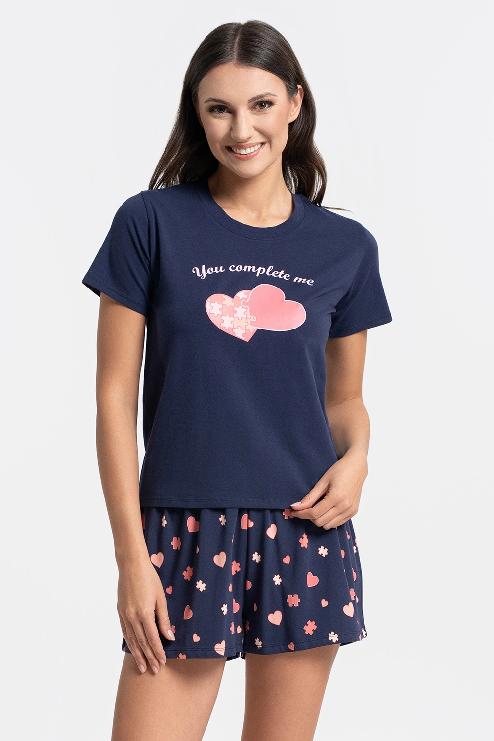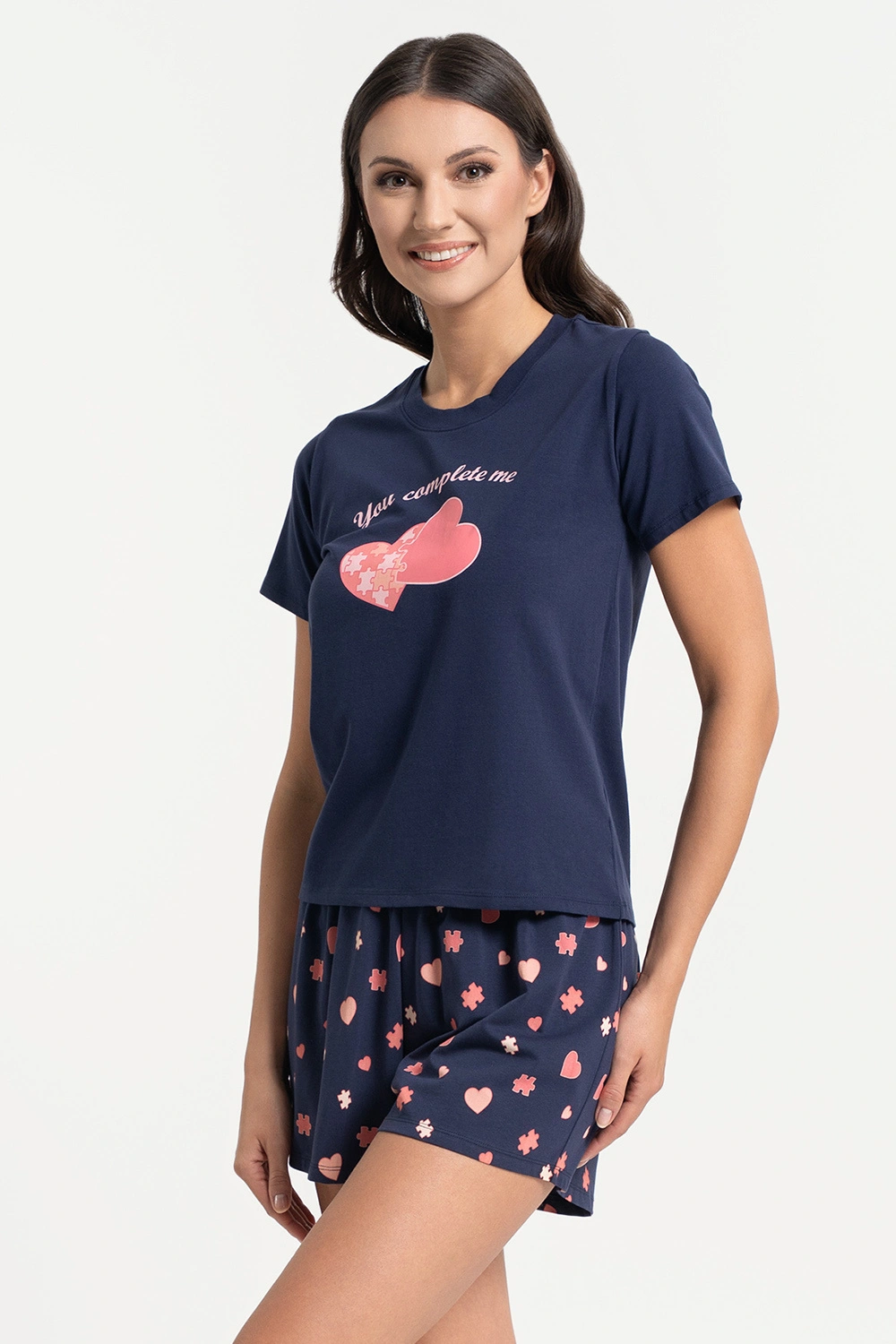 Dwuczęściowa piżama Moraj łączy miękką dzianinę bawełnianą z elastycznym wykończeniem, dzięki czemu przyjemnie układa się na ciele i nie krępuje ruchów. Góra to klasyczny t-shirt z krótkim rękawem i okrągłym dekoltem, ozdobiony dużym, dekoracyjnym nadrukiem na przodzie. Gładka, miękka dzianina zapewnia komfort i oddychalność, sprawdzając się zarówno w nocy, jak i podczas leniwych poranków. Szorty mają krótką długość i elastyczną talię, która dopasowuje się do sylwetki. Boki są subtelnie zaokrąglone, co podkreśla swobodny, domowy charakter kompletu. Na powierzchni szortów widać drobny, gęsty wzór, uzupełniony lamówką na krawędziach. Całość prezentuje się lekko i dziewczęco, jednocześnie pozostając praktyczna w codziennym użytkowaniu. To propozycja idealna na cieplejsze noce oraz jako wygodny zestaw do domowego relaksu. Komplet sprawdzi się dla osób ceniących prostą formę, miękkość materiału i komfort noszenia bez zbędnych dodatków.