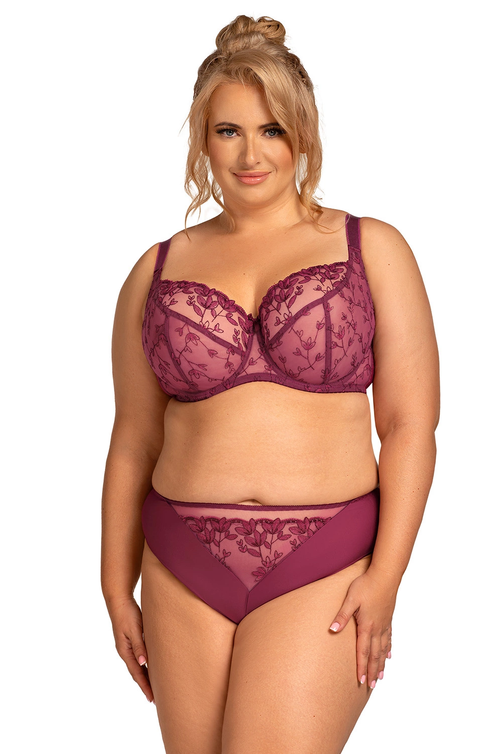 Miękkie miseczki na fiszbinach modelują i stabilnie podtrzymują biust, zachowując jego naturalny kształt. Trójdzielna konstrukcja z precyzyjnymi cięciami pomaga zebrać piersi ku środkowi i nadaje im ładną linię. Górna część miseczek została wykonana z półprzezroczystej siateczki ozdobionej roślinnym haftem, który subtelnie podkreśla dekolt. Dolne partie pozostają gładkie i matowe, dzięki czemu całość jest lekka i wygodna pod ubraniem. Mostek komfortowo przylega, a elastyczne skrzydełka pracują z ciałem w ruchu. Regulowane ramiączka pozwalają dopasować podparcie do potrzeb; zastosowano trwałe, metalowe regulatory. Zapięcie na plecach na haftki ułatwia zakładanie i stabilizuje obwód. Brak bocznych fiszbin zwiększa swobodę noszenia i miękkość w okolicy pach. Nessa Nel N500 to propozycja na co dzień dla osób, które lubią połączenie dekoracyjnych detali z funkcjonalnym wsparciem.