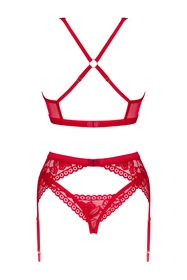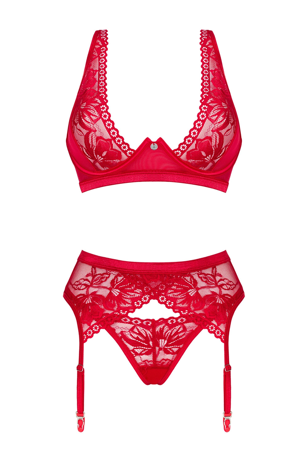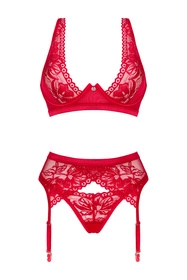 - trzyczęściowy czerwony komplet zawiera biustonosz, stringi i pas do pończoch
