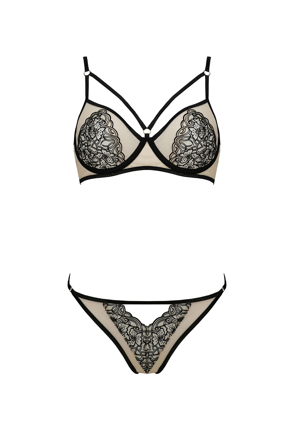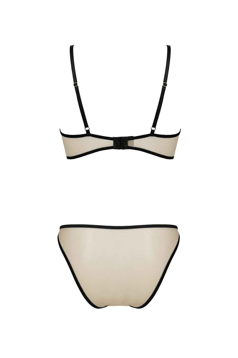 - komplet wykonany jest z beżowego materiału i czarnej koronki.