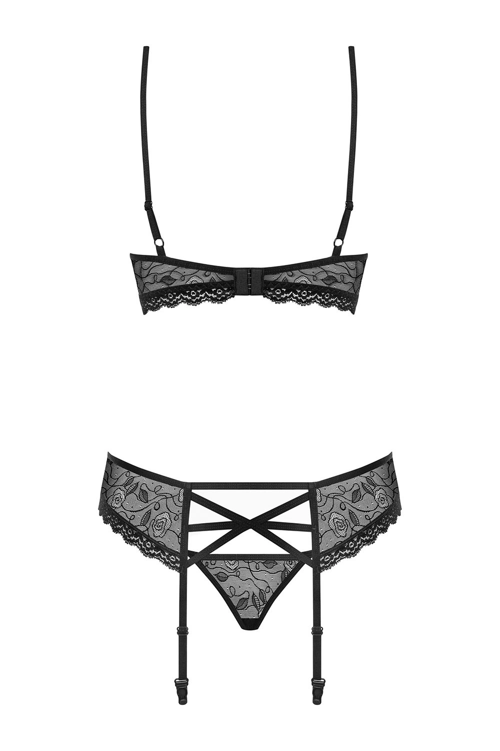 - w zestawie miękki biustonosz, uwodzicielski pas do pończoch i pasujące do całości stringi