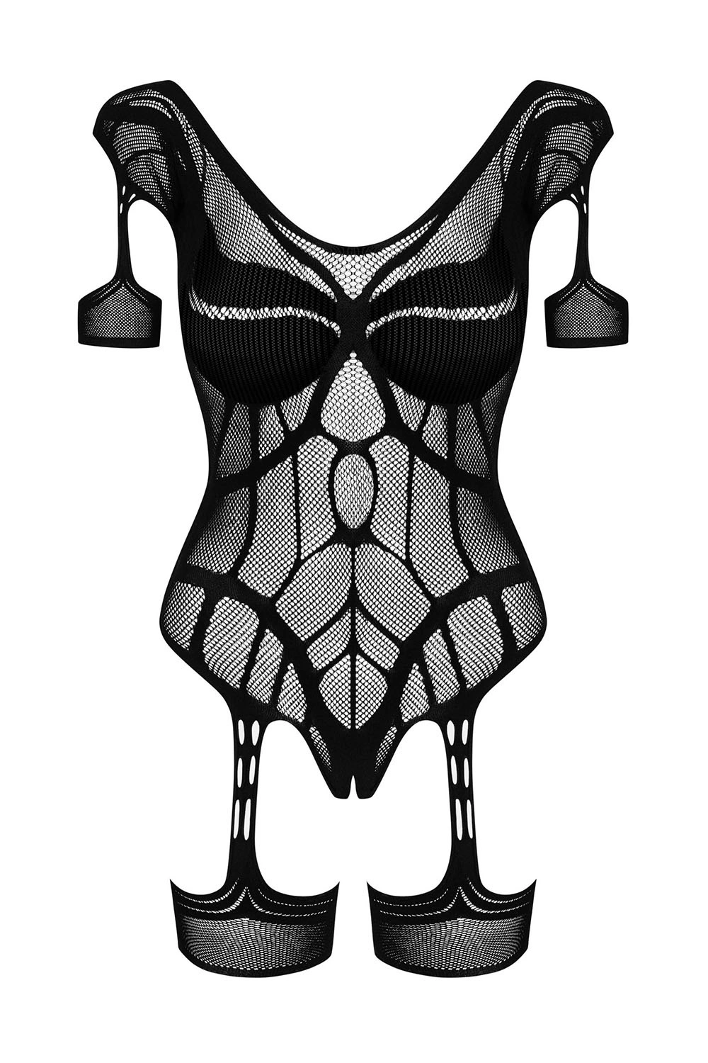 Oto mocno uwodzicielska propozycja dla kobiet spragnionych nowych wrażeń. Połączenie body o otwartym kroku z elastycznymi podwiązkami podgrzeje atmosferę w Twojej sypialni. Krótki rękawek pasujący do podwiązek, delikatna siateczka oplatająca ciało, geometryczny wzór podkreślający piersi i piękne wycięcie na placach – czego chcieć więcej?