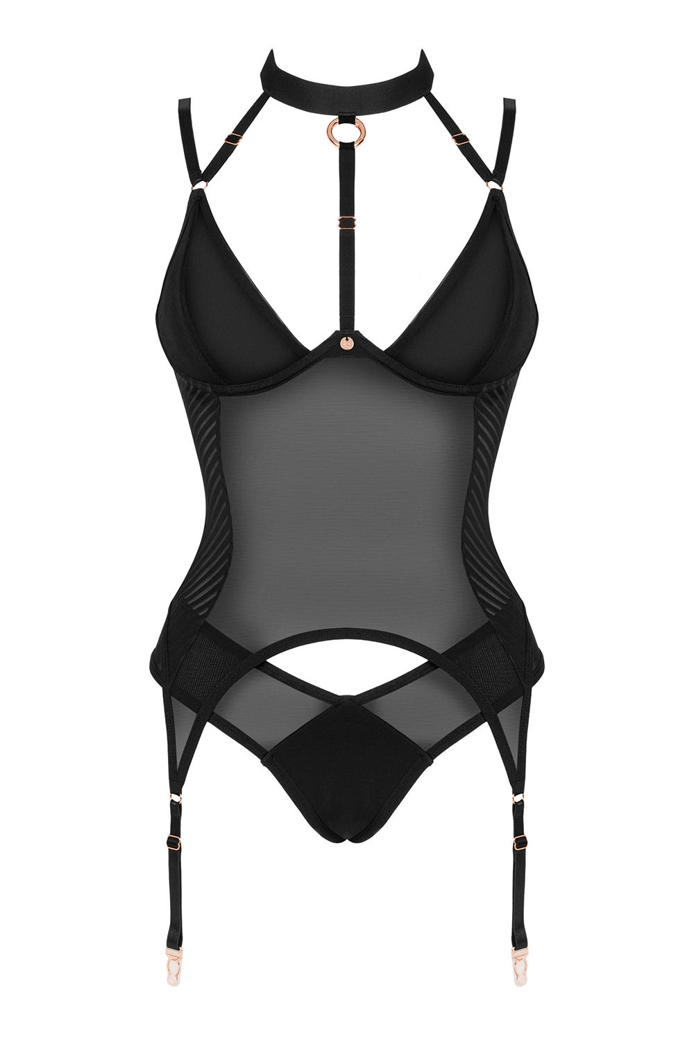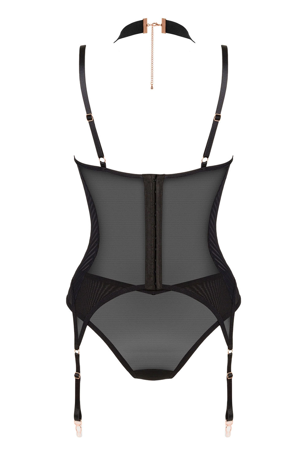 Czarny gorset Brasica to minimalistyczny krój połączony z pięknymi dodatkami w odcieniu różowego złota. To wyjątkowo elegancka propozycja, uszyta z delikatnej siateczki, na wiele gorących okazji. Boki gorsetu zdobione paseczkami pięknie podkreślą Twoją talię. Zapięcia na haftki, pasujące figi oraz biżuteryjne zapięcie na szyi – całość wywrze (zapewne nie tylko na Tobie) piorunujące wrażenie!