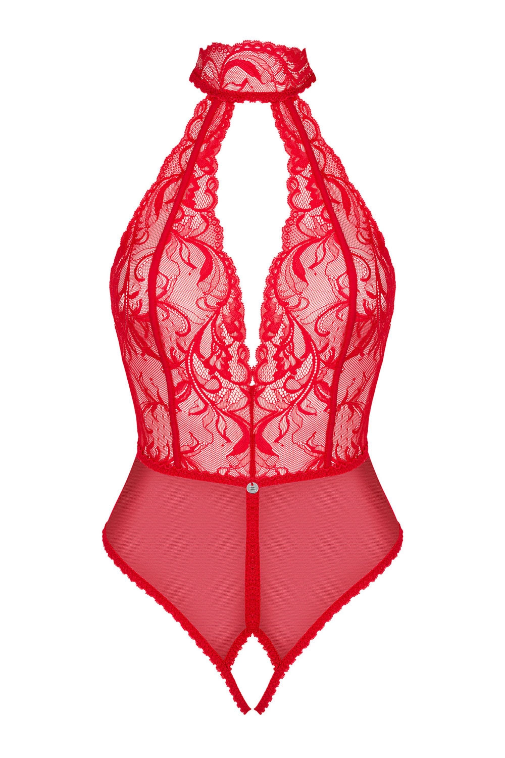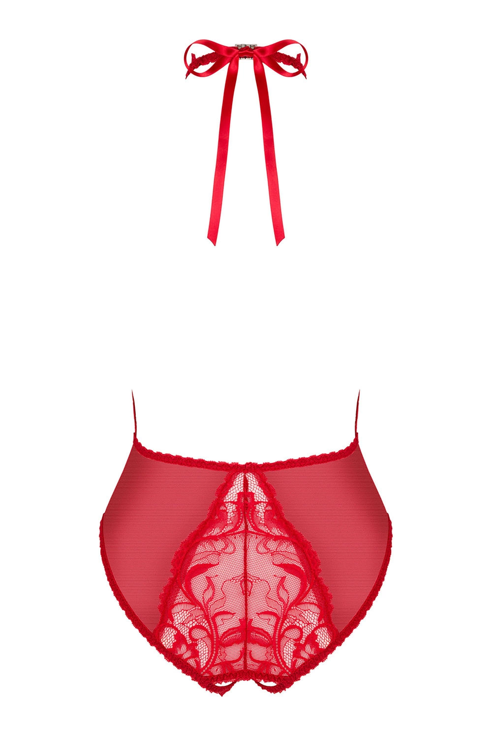 Pełne seksapilu, koronkowe body Dagmarie kusi soczystą czerwienią i zniewala seksownym krojem podkreślającym wszystkie atuty sylwetki. Głęboki dekolt pięknie eksponuje biust, a odsłonięte plecy intrygują i kuszą. Otwarty krok zachęca do gorących przyjemności w sypialni i rozpala wyobraźnię – musisz spróbować!