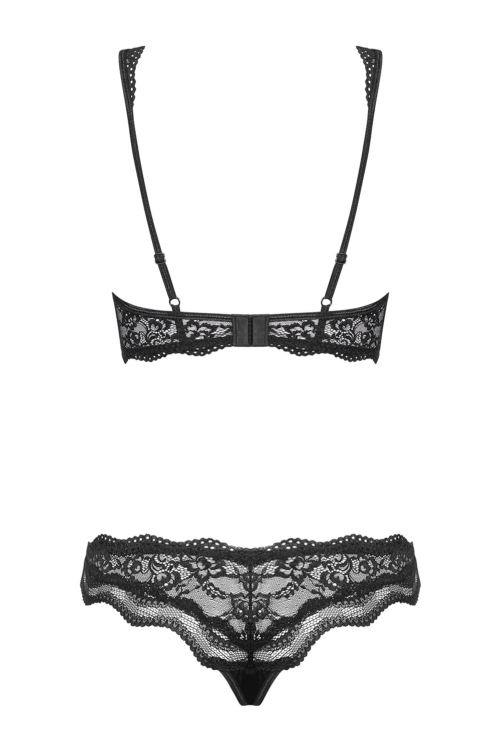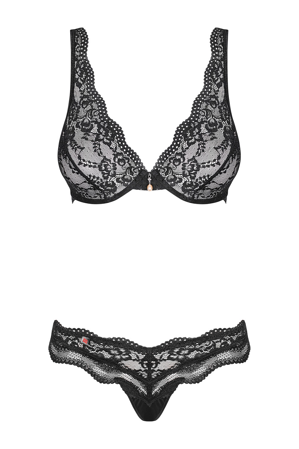 Seksownie skrojony biustonosz i figi w kolorze intensywnej czerni, tworzą wyjątkowy komplet Luvae. Mała perełka na środku biustonosza dodaje szyku, a zastosowane w miseczkach fiszbiny, dadzą komfort i wspaniałe samopoczucie w czasie noszenia.