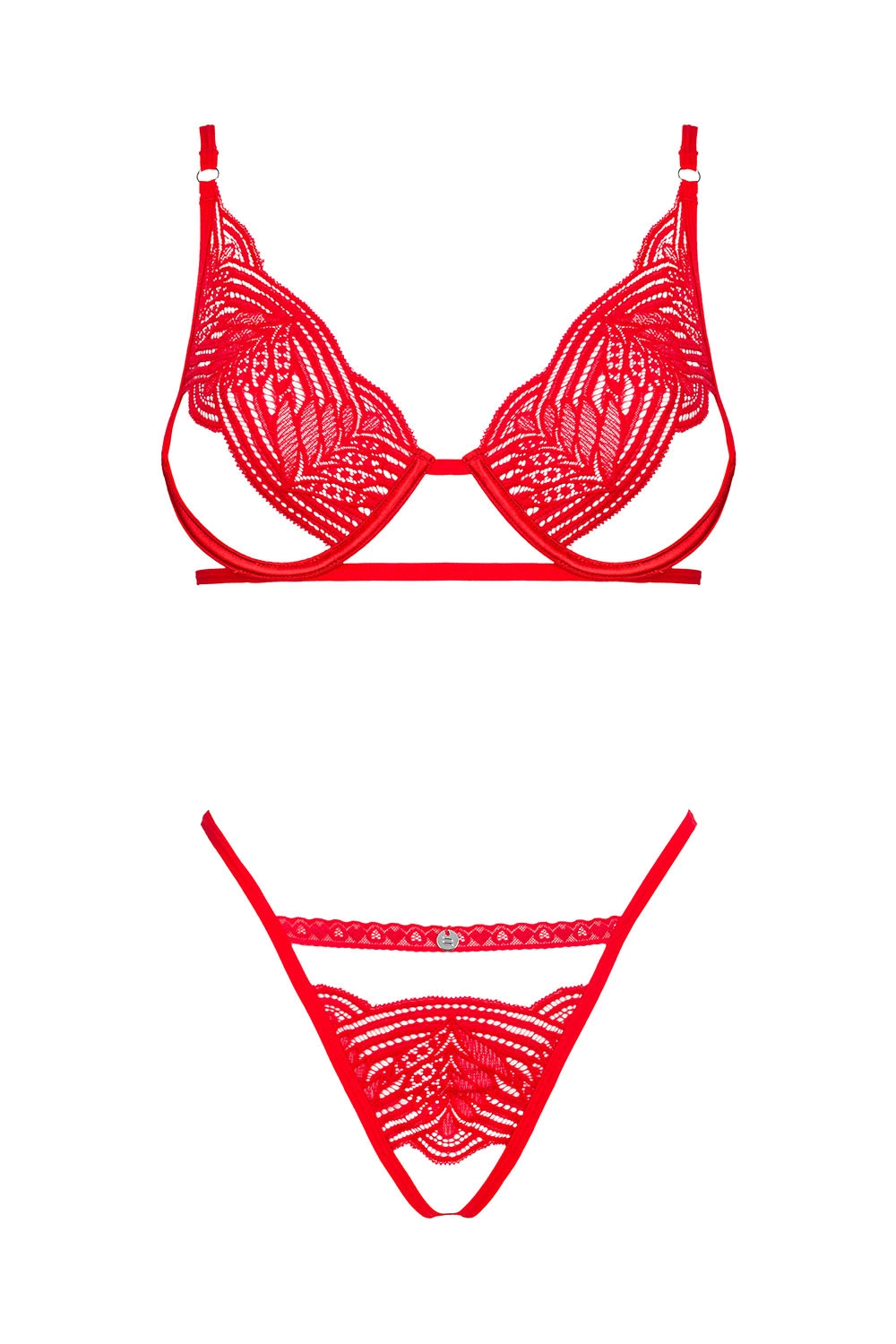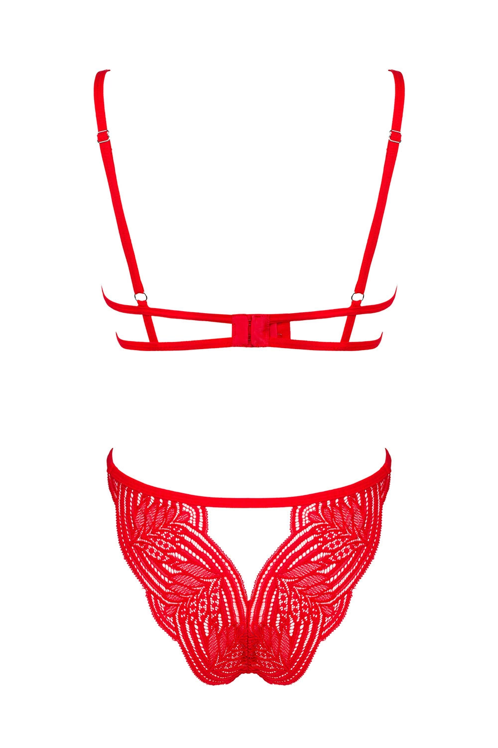 Odważny komplet Mellania w kolorze głębokiej czerwieni. Seksowne wycięcia przyciągają uwagę i dodają pikanterii. Delikatna koronka o wyjątkowym wzorze pięknie prezentuje się na ciele, elegancko podkreślając atuty sylwetki. Majtki z otwartym krokiem pozwalają na jeszcze więcej wygody i zabawy w sypialni. Komplet Mellania tworzy wyjątkowo kobiecą stylizację w połączeniu z pończochami samonośnymi z tej samej kolekcji.