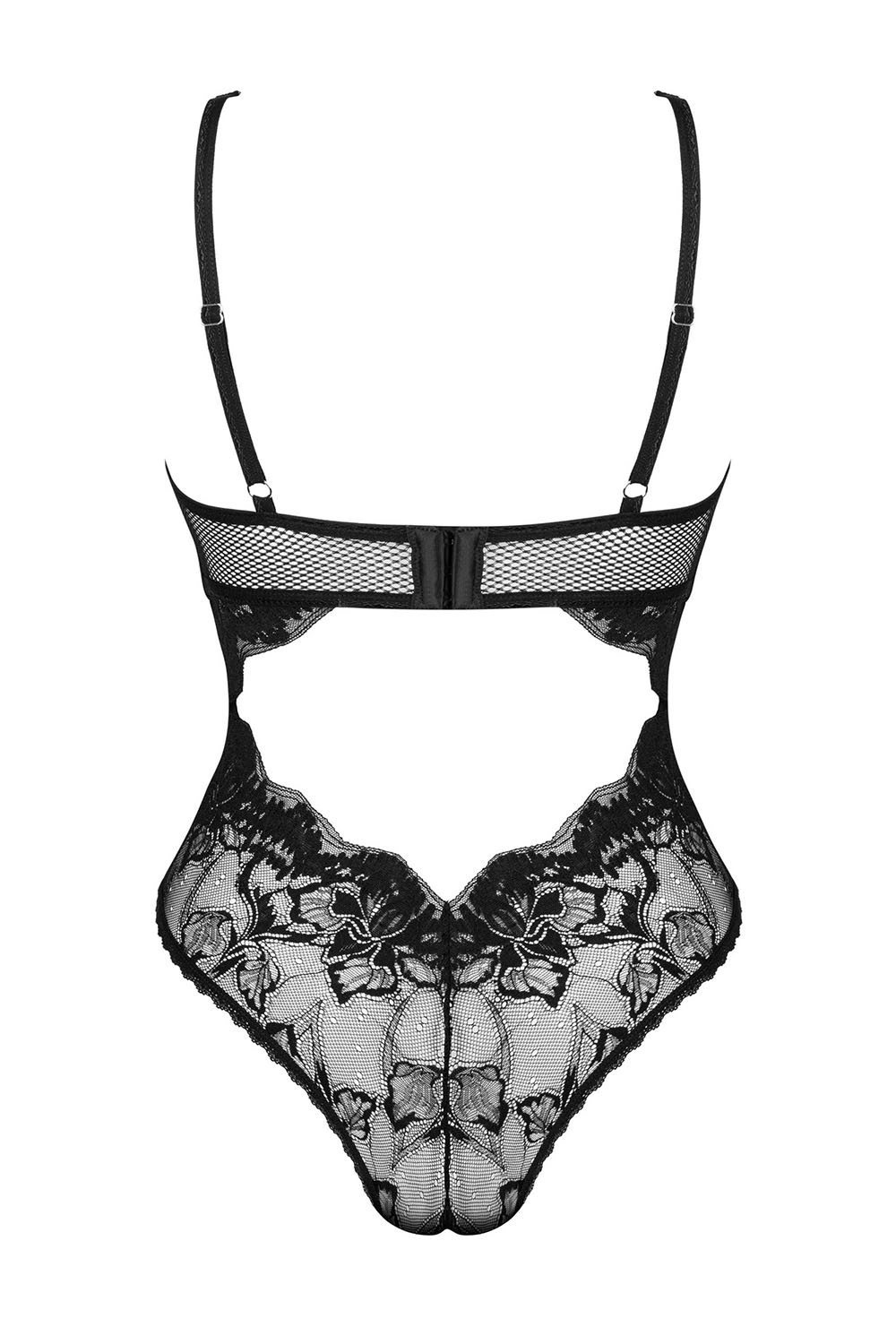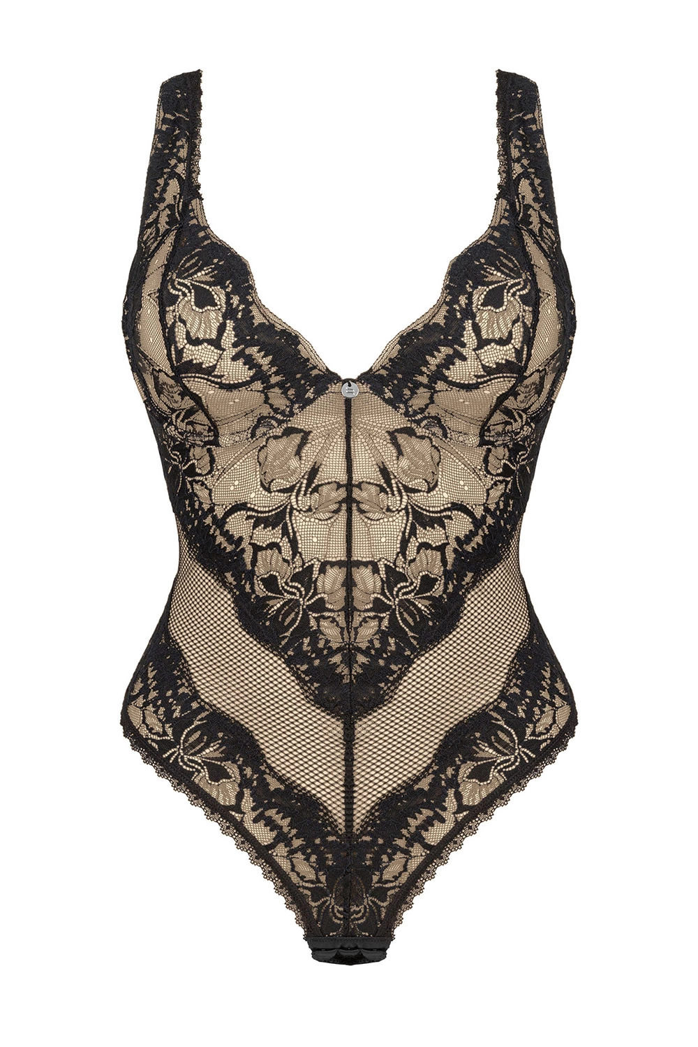 Koronkowe body Olvidia zachwyca od pierwszego wejrzenia. Noszone na Twoim ciele, będzie prezentować się jeszcze lepiej! Kwiatowa koronka z przodu podszyta została delikatną, beżową siateczką. Tył odsłania nieco więcej, a ciekawe wycięcie na plecach pięknie podkreśla talię. Dasz się skusić?