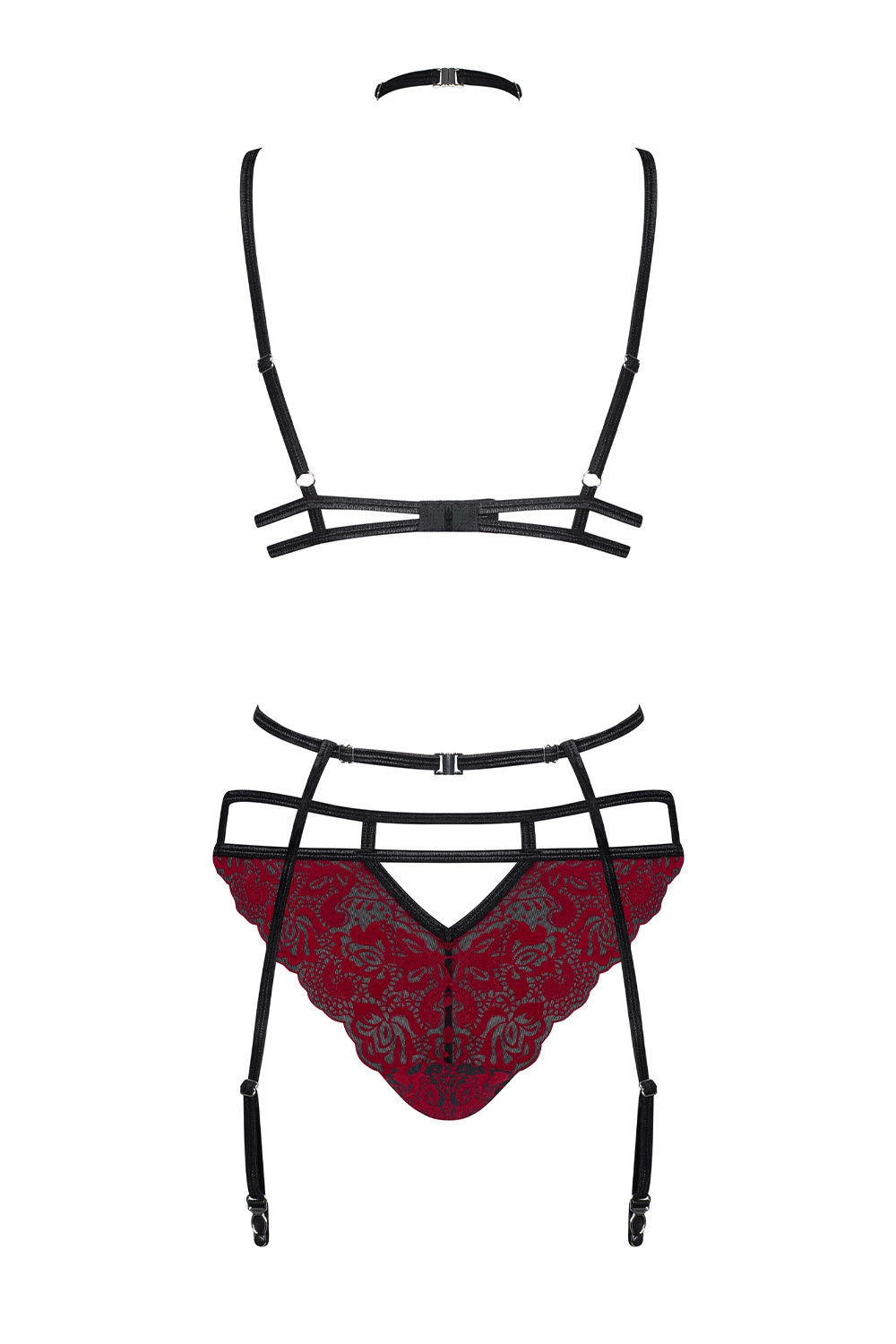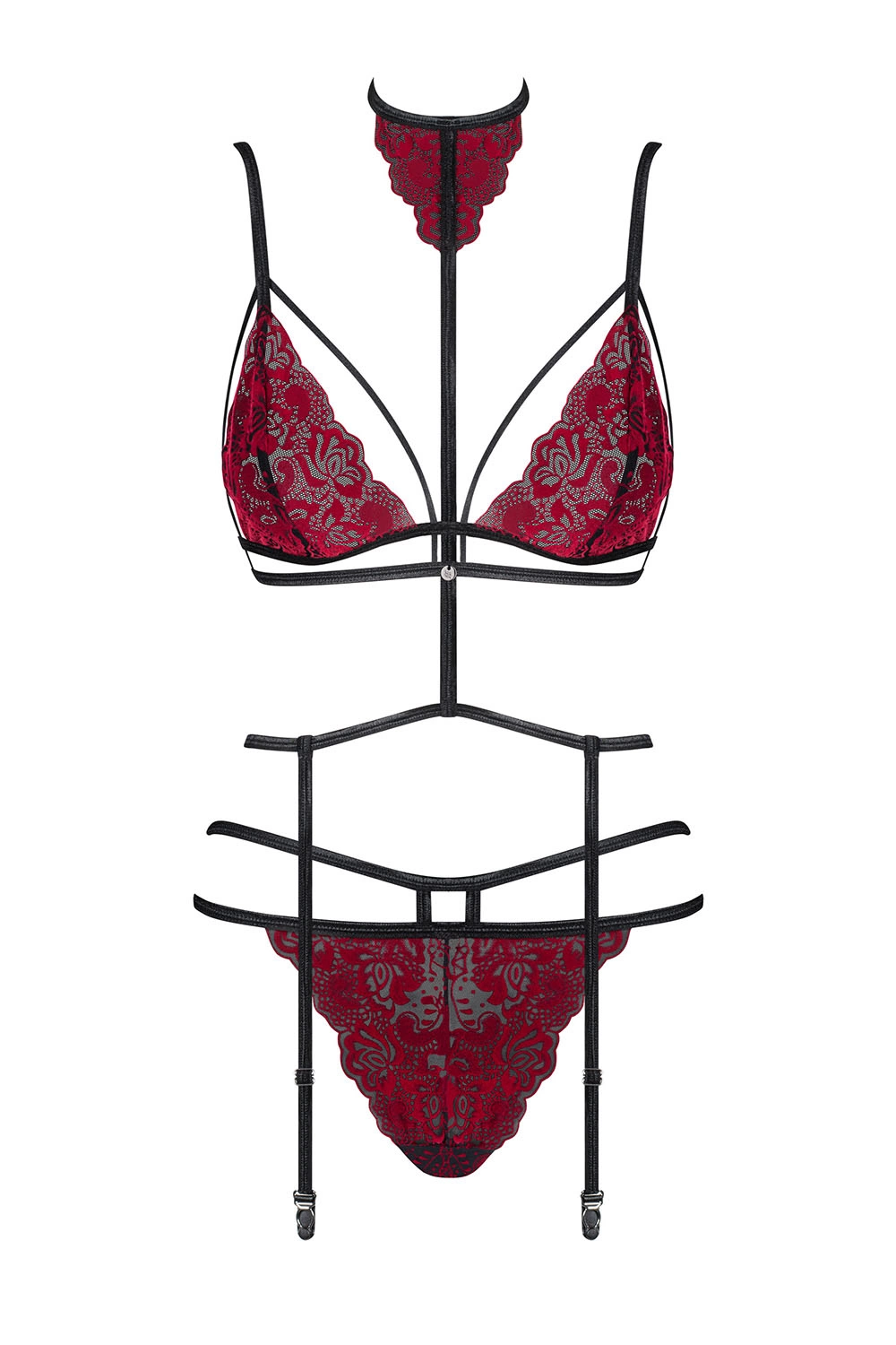 - koronkowy biustonosz, figi oraz choker i pas do pończoch połączone paseczkiem