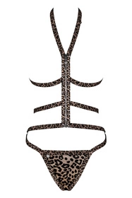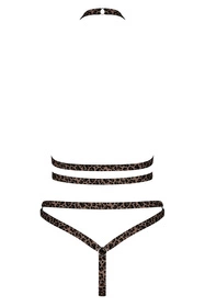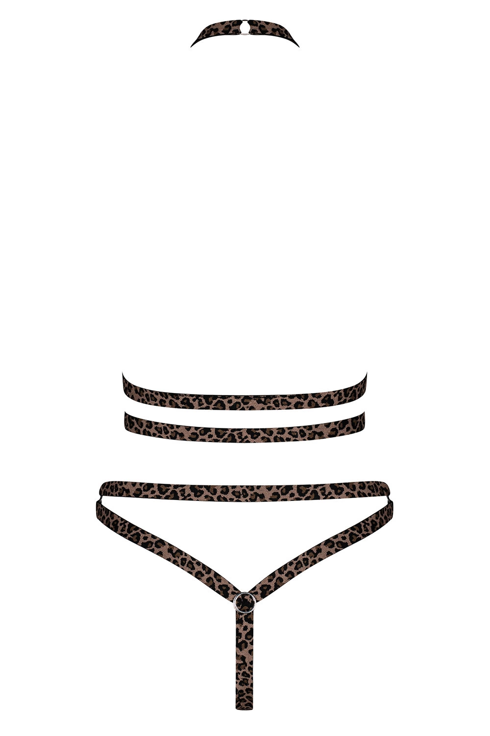 Komplet Tigrita to miękki top stworzony z paseczków i seksowne stringi. Mmm, brzmi bardzo uwodzicielsko, prawda? Zamknij oczy i wyobraź sobie fantazyjnie podkreślone piersi i zmysłowo zaznaczone pośladki. Paseczek wokół szyi, zamek pomiędzy piersiami, subtelne paseczki w cętki. Chcesz wypróbować ten komplet?