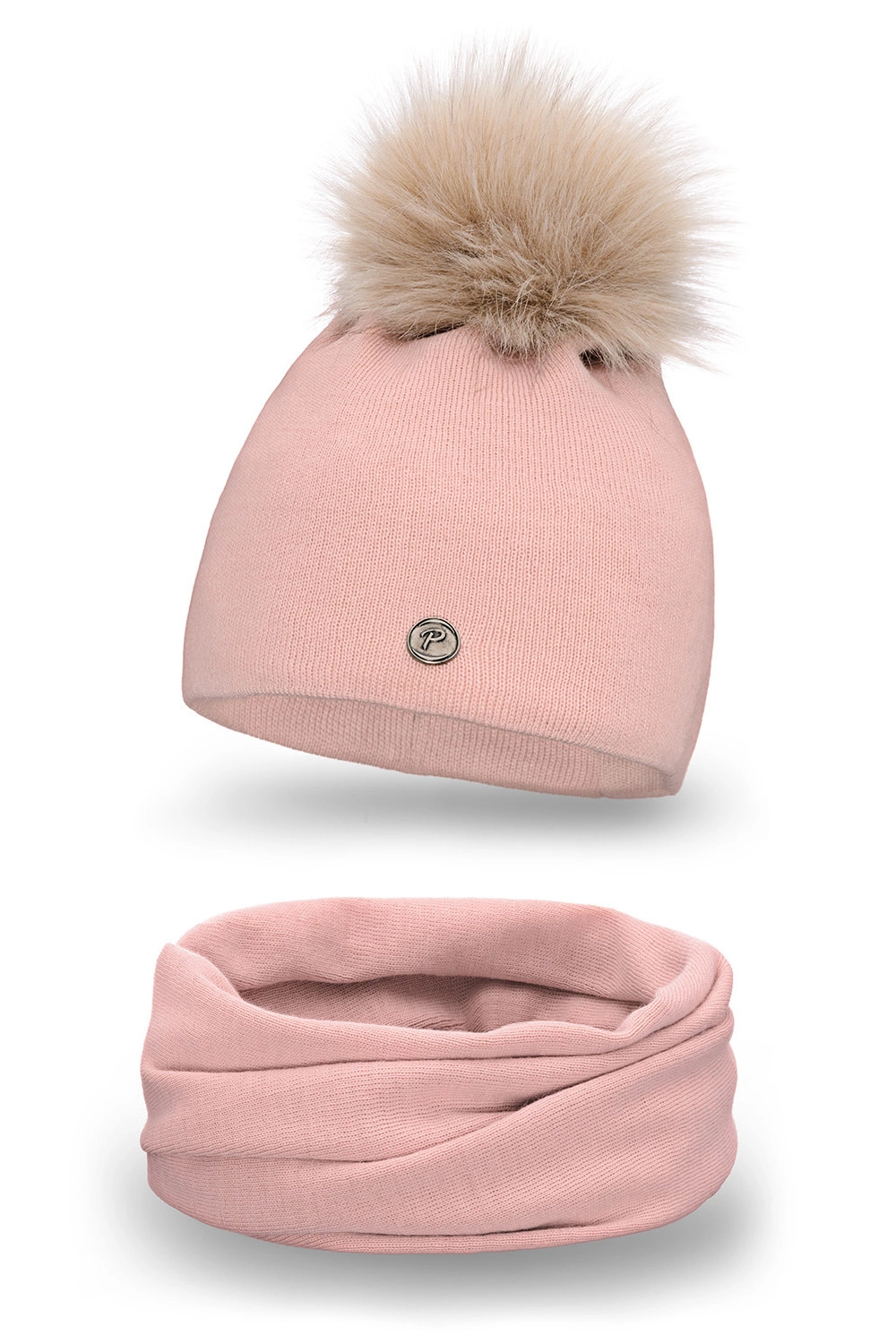 Pamami 15534+15604 komplet czapka z pomponem i komin pudrowy róż
