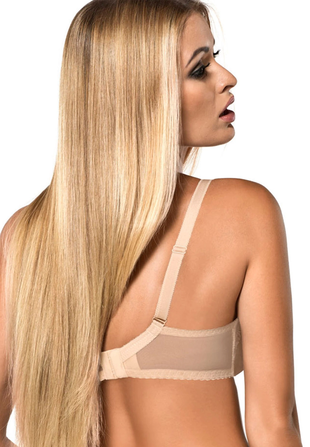 Subtelny, miękki biustonosz został wykonany z delikatnego haftu, który doskonale komponuje się z siateczką na boczkach. Łezka między miseczkami przyciąga uwagę i nadaje temu modelowi figlarny charakter.