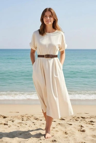 Pasek ze skóry naturalnej z zaokrągloną złotą klamerką.