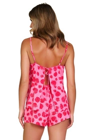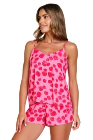 Komplet piżamowy Doctor Nap 7363 łączy koszulkę na ramiączkach i luźne szorty. Koszulka ma prosty krój i cienkie ramiączka, a na plecach zaprojektowano rozcięcie z wiązaniem, które dodaje swobody i ułatwia dopasowanie. Wiskoza układa się lekko i nie opina sylwetki. W pasie szortów wszyto komfortową gumkę, która stabilnie trzyma, nie uciskając. Nogawki są krótkie i swobodne, zapewniając wygodę w czasie snu. Całość zdobi powtarzalny motyw roślinny widoczny na obu elementach. Materiał jest oddychający i przyjemny w dotyku, co sprawdzi się o każdej porze nocy. Zestaw dobrze wygląda zarówno jako komplet, jak i noszony osobno z innymi elementami domowej garderoby. Sprawdzi się w domu, w podróży i na weekendowe wyjazdy. To funkcjonalny wybór do codziennego odpoczynku i komfortowego snu.