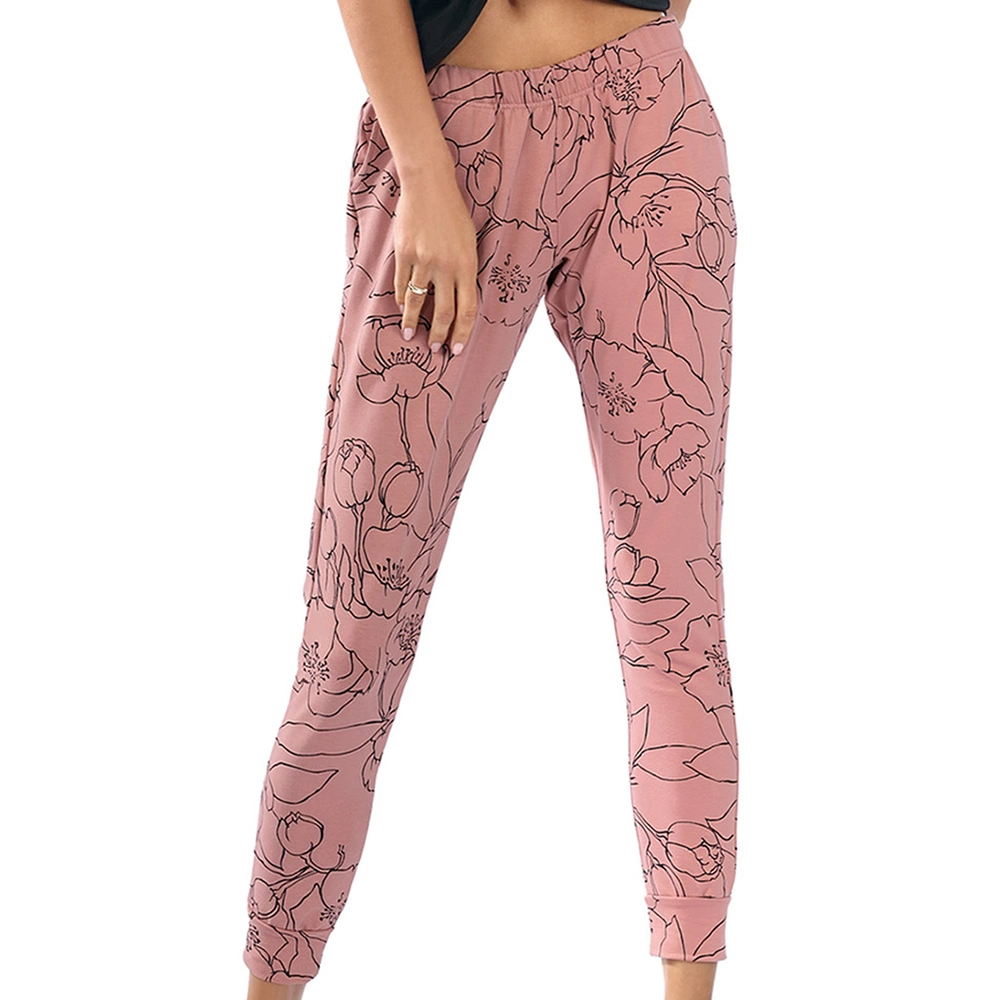 Różowe spodnie - joggery w delikatne, czarne kwiaty. Ten model jest nie tylko bardzo wygodny, ale też idealnie dopasowany do kobiecej figury. Uniwersalny fason sprawdzi się w codziennej stylizacji.