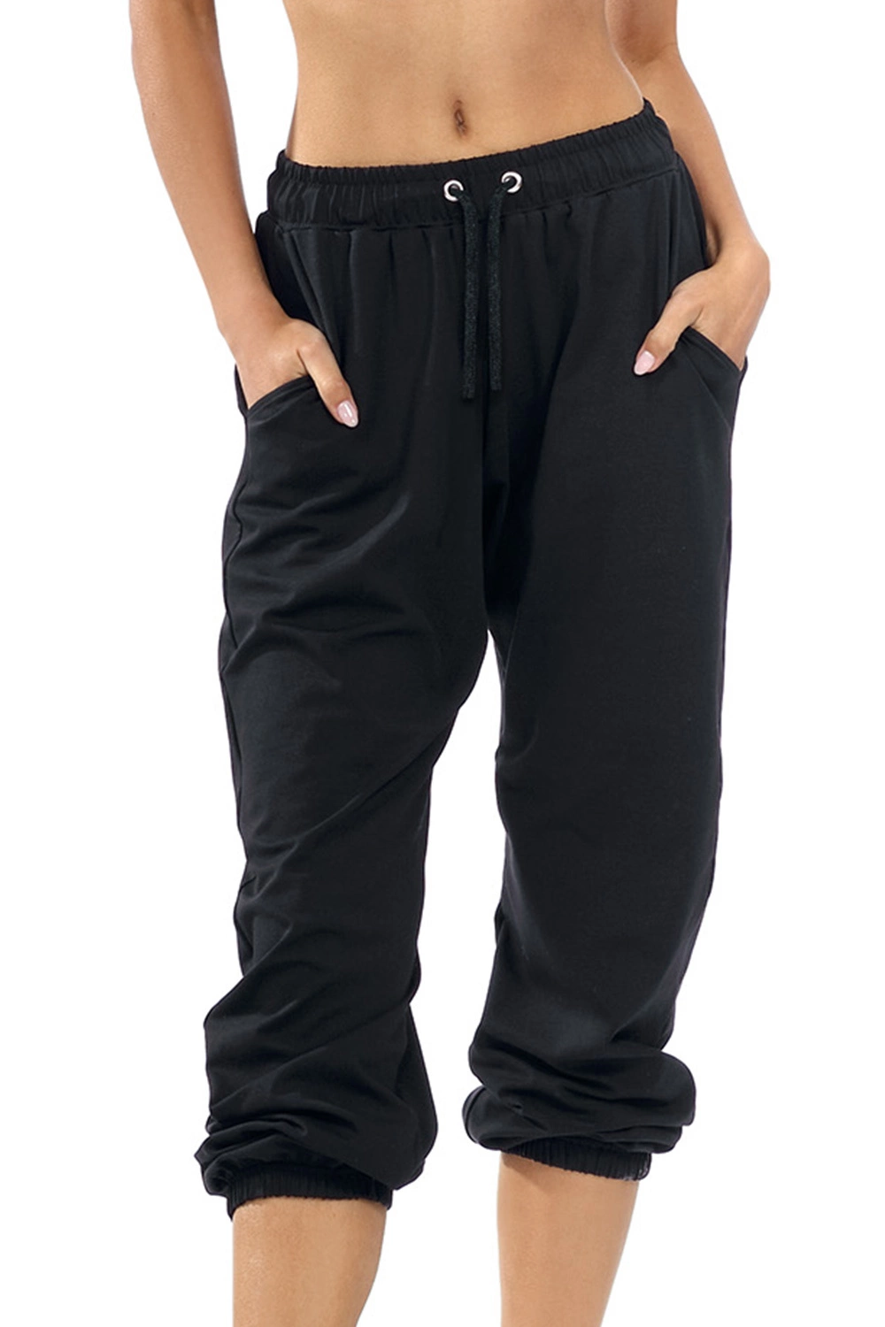 Bawełniane spodnie w czarnym kolorze. Ten model jest nie tylko bardzo wygodny, ale też idealnie dopasowany do kobiecej figury. Uniwersalny fason sprawdzi się zarówno w codziennej jak i sportowej stylizacji.