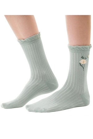 Miękkie, elastyczne skarpetki w roślinne wzory. Wykonane są z wysokiej jakości, prążkowanej bawełny. Doskonałe na każdy dzień. Góra wykończona falbanką.