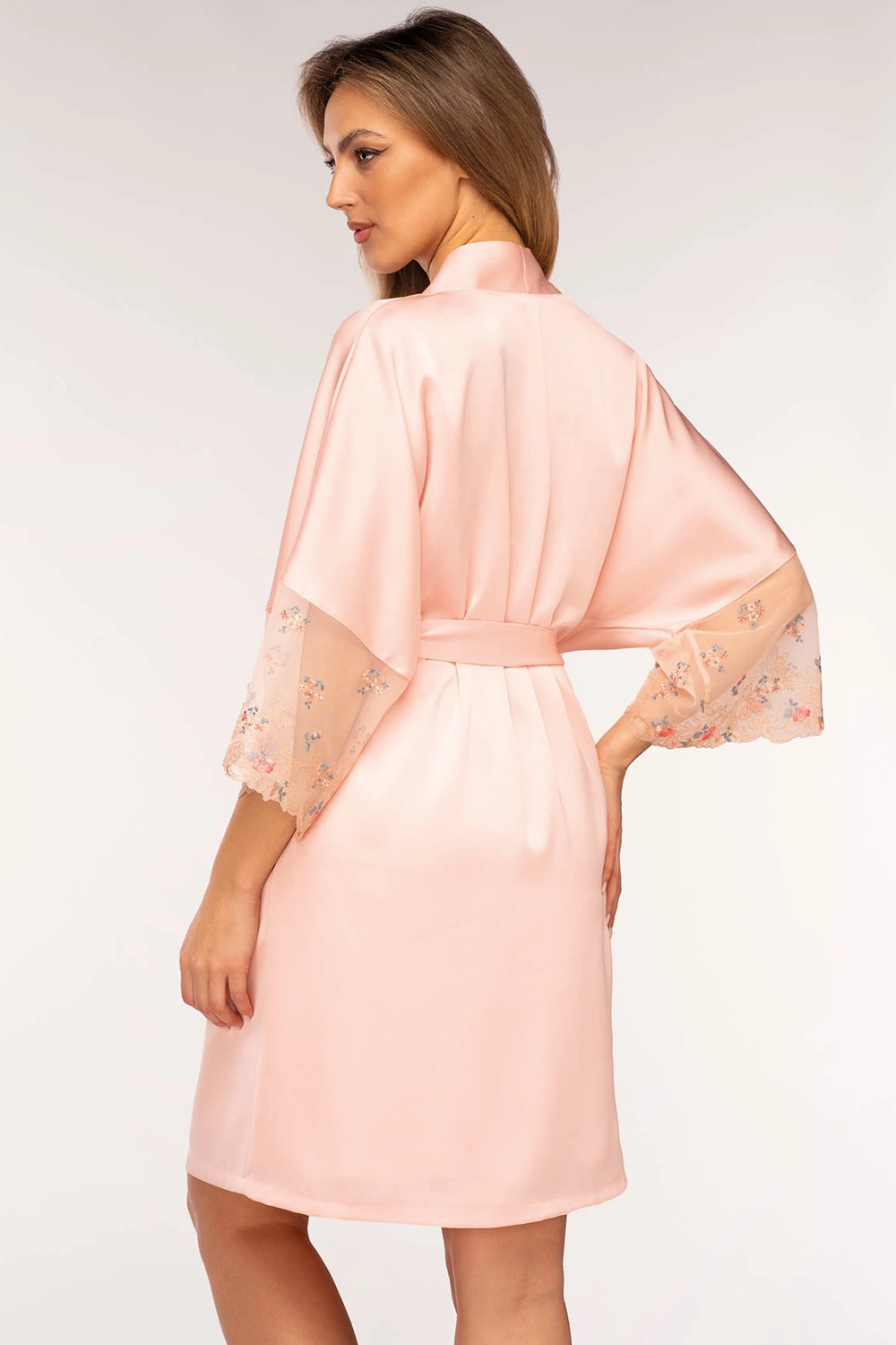 Elegancki, satynowy szlafrok w różowym kolorze.