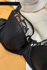 - między miseczkami i na ramiączkach ozdobne kokardki