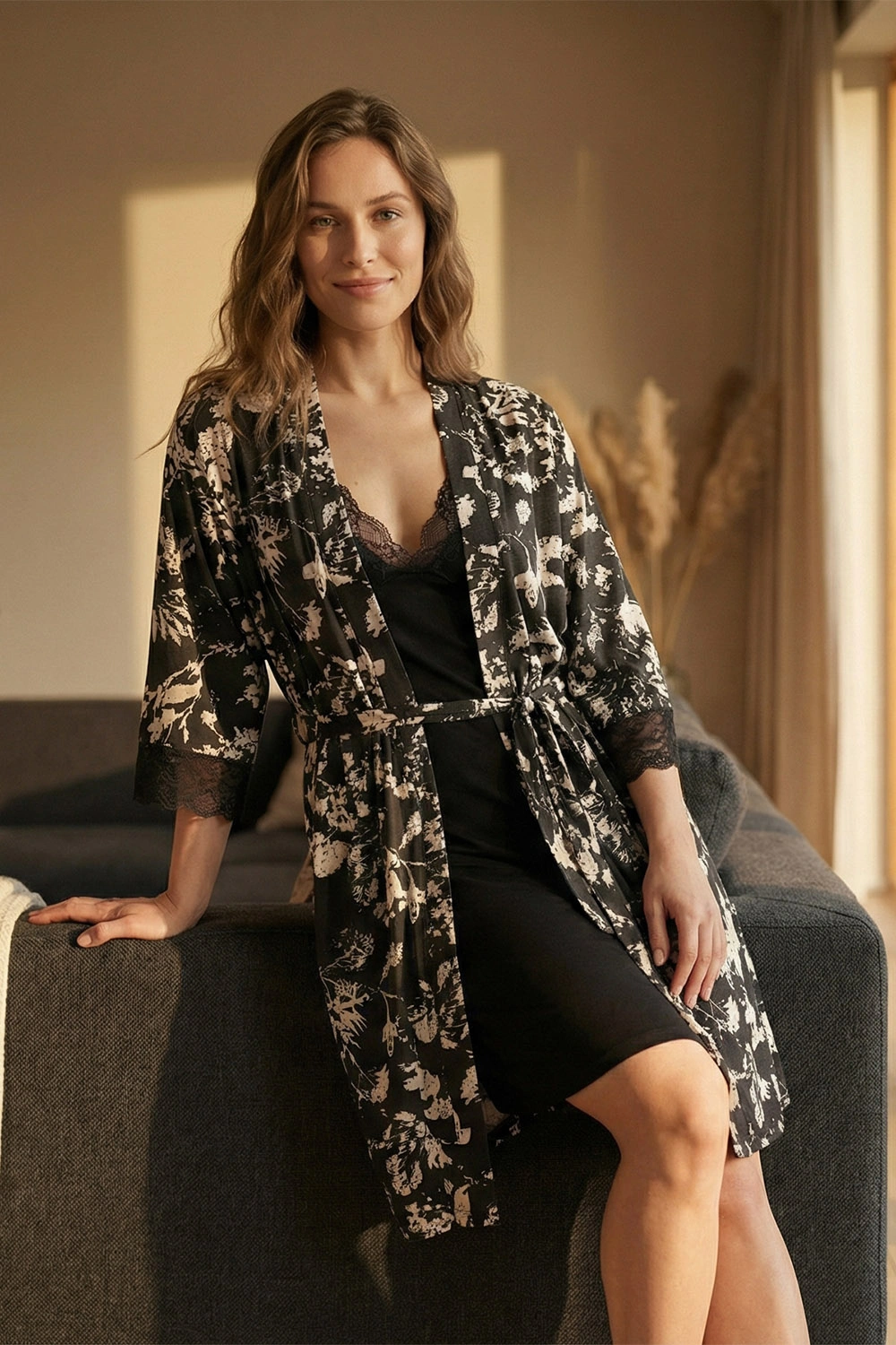 Vivisence 2059 to komplet nocny łączący lekką koszulkę i krótki peniuar z miękkiej dzianiny modalowej. Materiał jest przyjemny w dotyku i elastyczny, dzięki czemu gładko układa się na sylwetce i pracuje z ciałem. Koszulka ma dekolt w szpic, który subtelnie podkreśla linię szyi i dekoltu. Peniuar wiązany z przodu pozwala łatwo dopasować talię i wygodnie narzucić go o każdej porze. Krótsza długość obu elementów sprzyja swobodzie ruchów i sprawdza się na co dzień w domu. Proste, staranne wykończenia podkreślają minimalistyczny charakter kompletu. To praktyczna propozycja na wieczorny relaks i komfortowy sen przez cały rok. Wysoka jakość wykonania dopełnia całości i wspiera codzienny komfort.