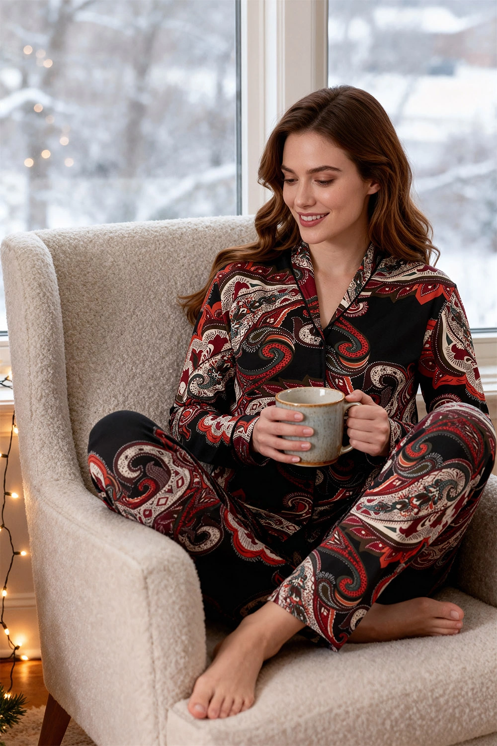 Piżama Vivisence 2063 łączy miękkość wiskozy z elastycznością, zapewniając wygodę od pierwszego dotyku. Góra ma klasyczny, koszulowy krój z zapięciem na guziki i dekoltem układającym się w kształt litery V, co subtelnie podkreśla szyję. Na tkaninie widoczny jest elegancki, dekoracyjny wzór, który dodaje całości ponadczasowego charakteru. Długi rękaw sprawdzi się w chłodniejsze wieczory, a staranne wykończenia podnoszą komfort noszenia. Spodnie są długie, z elastyczną talią, dzięki czemu dobrze układają się na sylwetce i nie uciskają podczas snu. Praktyczne kieszenie zwiększają funkcjonalność kompletu w domowych rytuałach. Dzianina jest przyjemna w dotyku i pracuje z ciałem, co ułatwia swobodę ruchów. To propozycja na codzienny relaks, wieczorne czytanie i spokojny sen. Jeśli cenisz prostą elegancję, klasyczny fason i miękkie materiały, ten model będzie trafionym wyborem.