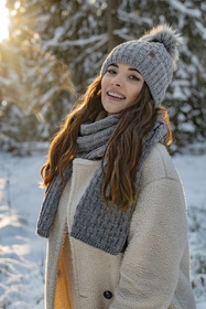 Modny zestaw damski: czapka z pomponem i szalik.