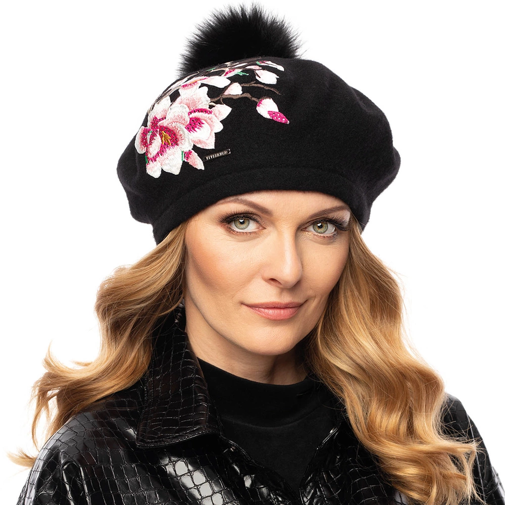 Przy jego produkcji została wykorzystana wysokiej jakości żywa wełna Woolmark®. Przędza potwierdzona jest certyfikatem Oeko-Tex standard. Beret zdobi kwiecista aplikacja z dodatkiem strasów. Górę beretu zdobi odpinany pompon z futra lisa. Zaletą beretu są ręcznie wyszywane zdobienia, dzięki czemu każdy egzemplarz jest niepowtarzalny.