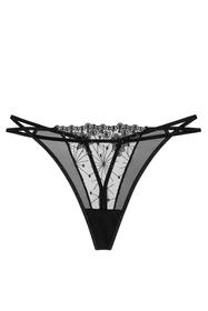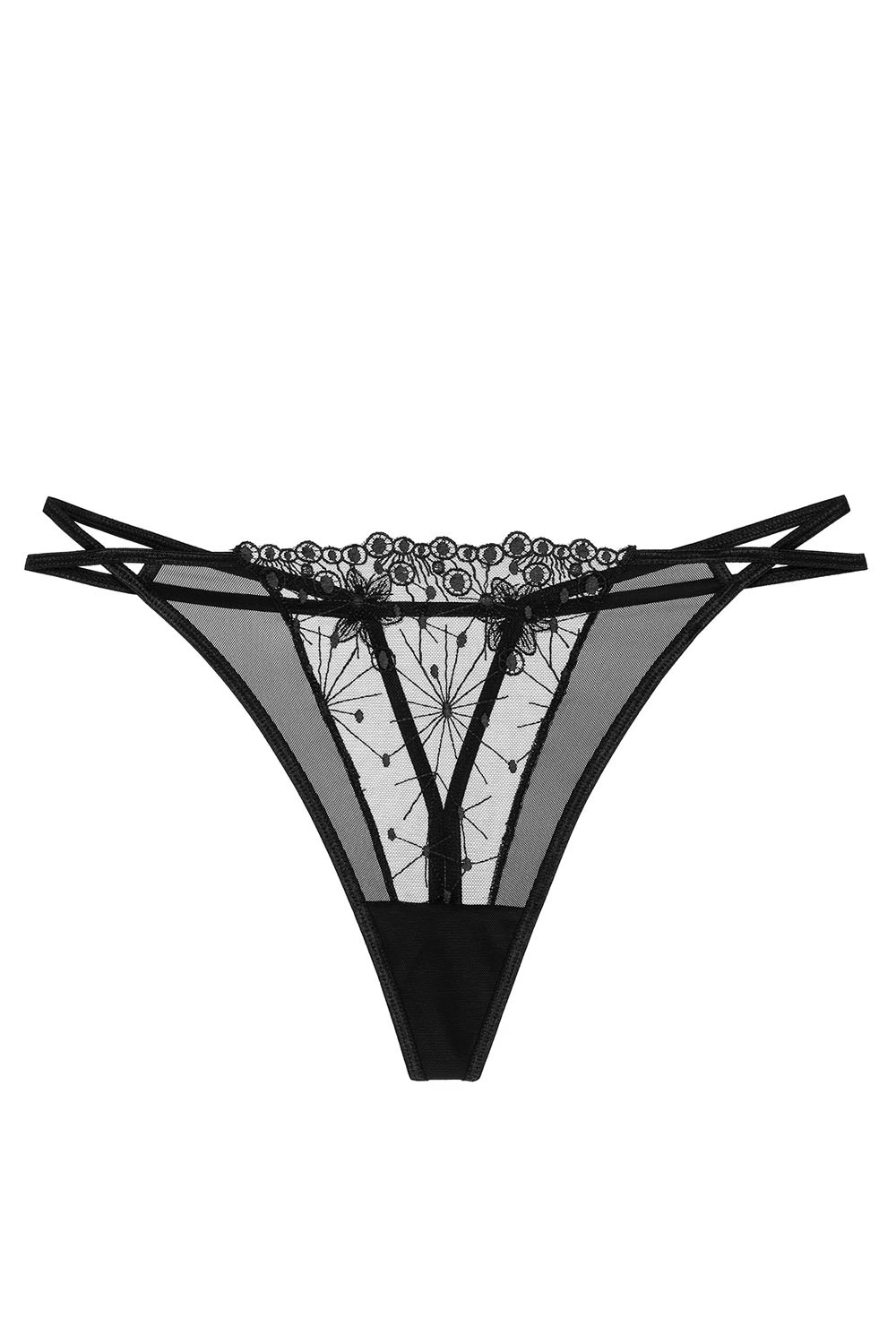 Seksowne stringi z cieniutką siateczką z przodu z wyhaftowanymi pajączkami. Łączące się dwa paseczki z tyłu łączą sie z dwoma haftowanymi kwiatuszkami.